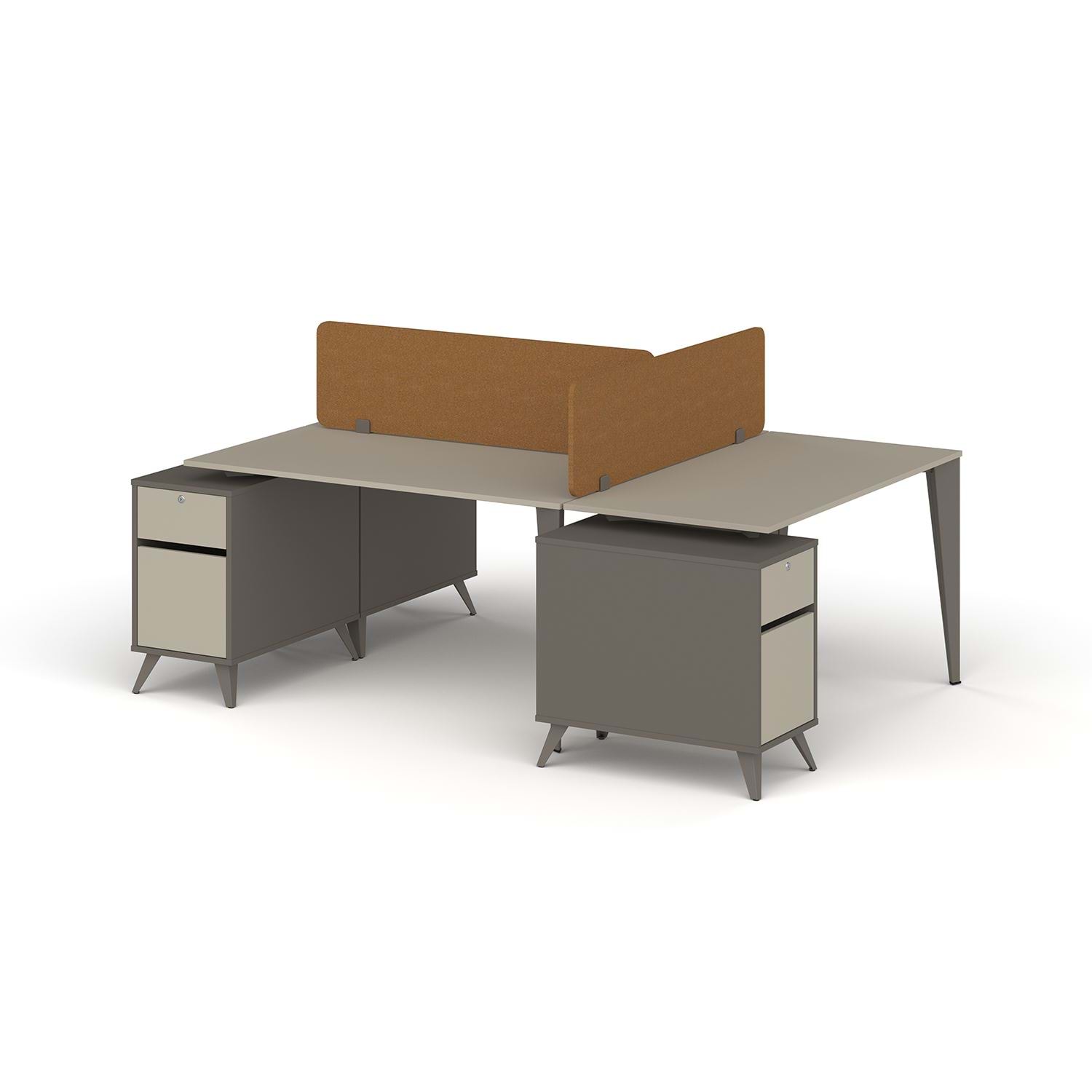 3 kişilik çalışma düzenine uygun olarak tasarlanan bu model, çalışanlara özel alan sağlayan bölücü panel, geniş masa yüzeyi ve depolama alanı sunan kilitli etajer modülleri ile maksimum konfor sağlar.