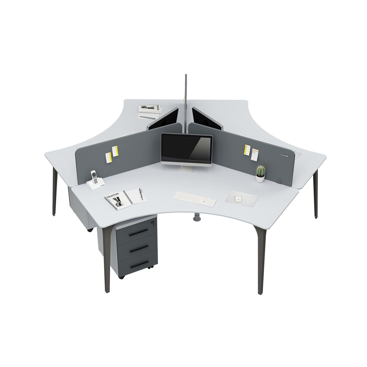 Çoklu çalışma masası ortak alan çalışma odalarında kullanıma uygun ebatlarda üretişmiştir. Ofis masası, ergonamik tasarımı ile tek alanda çoklu çözümler üretebilmektedir. Ofis mobilyasında bulunan bölücü panel tasarımı melamin malzemeden üretilmiştir.