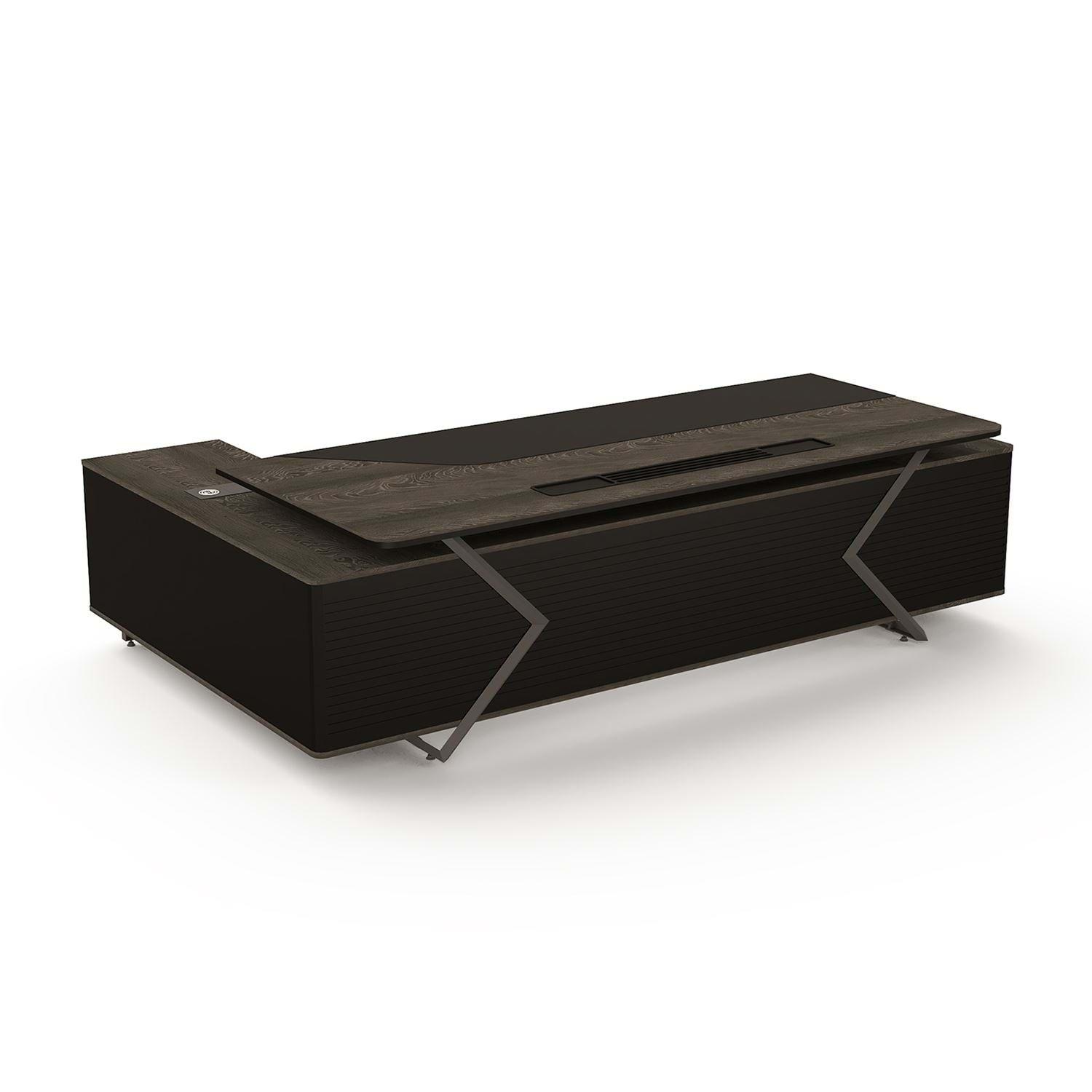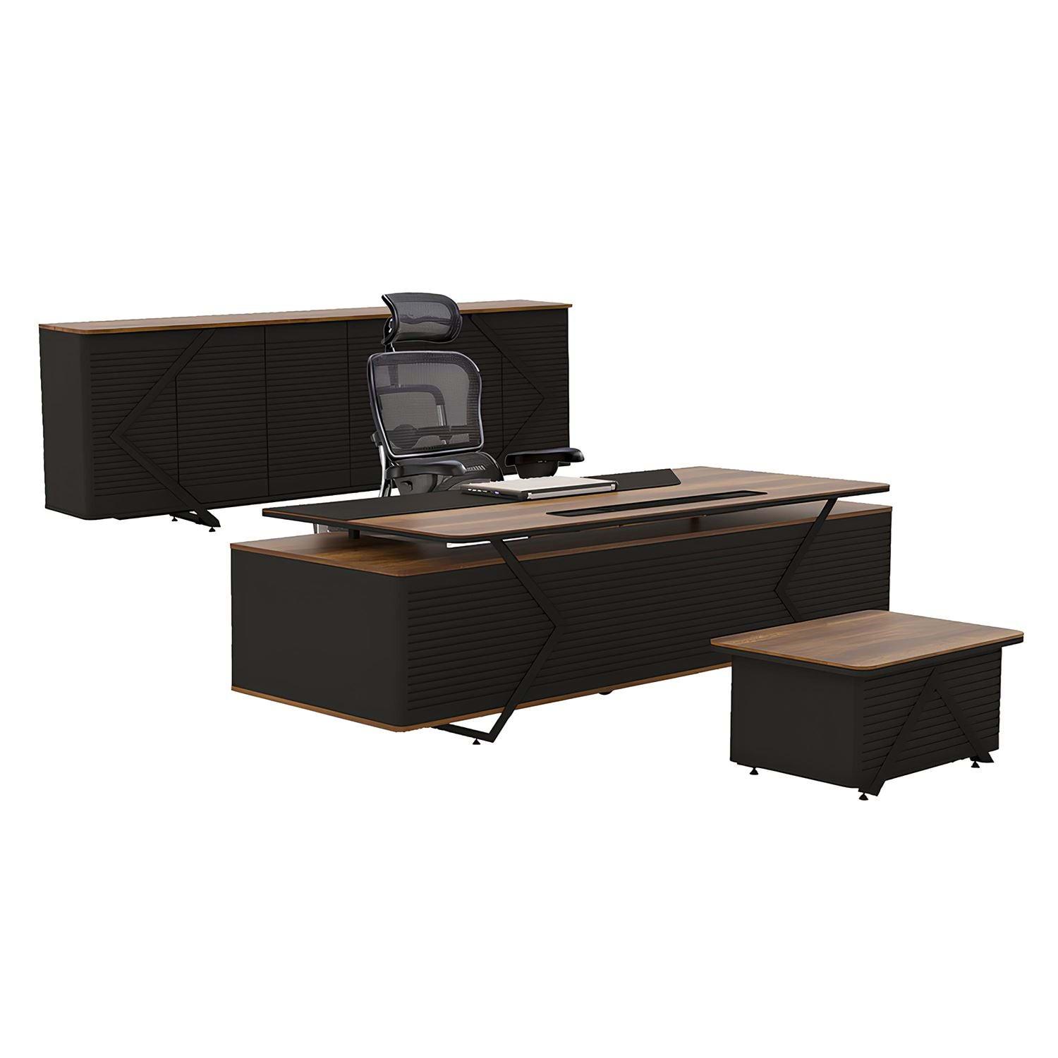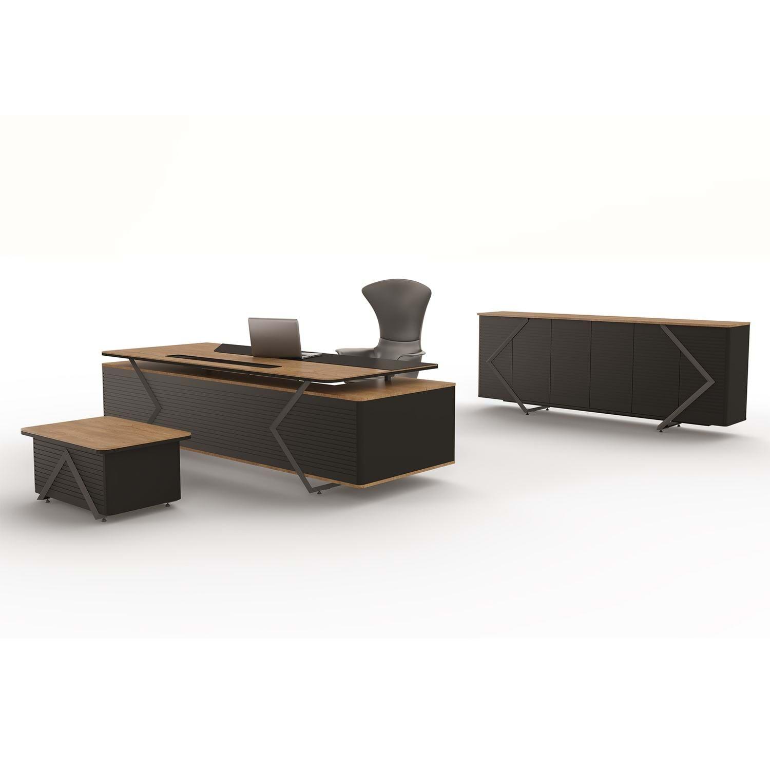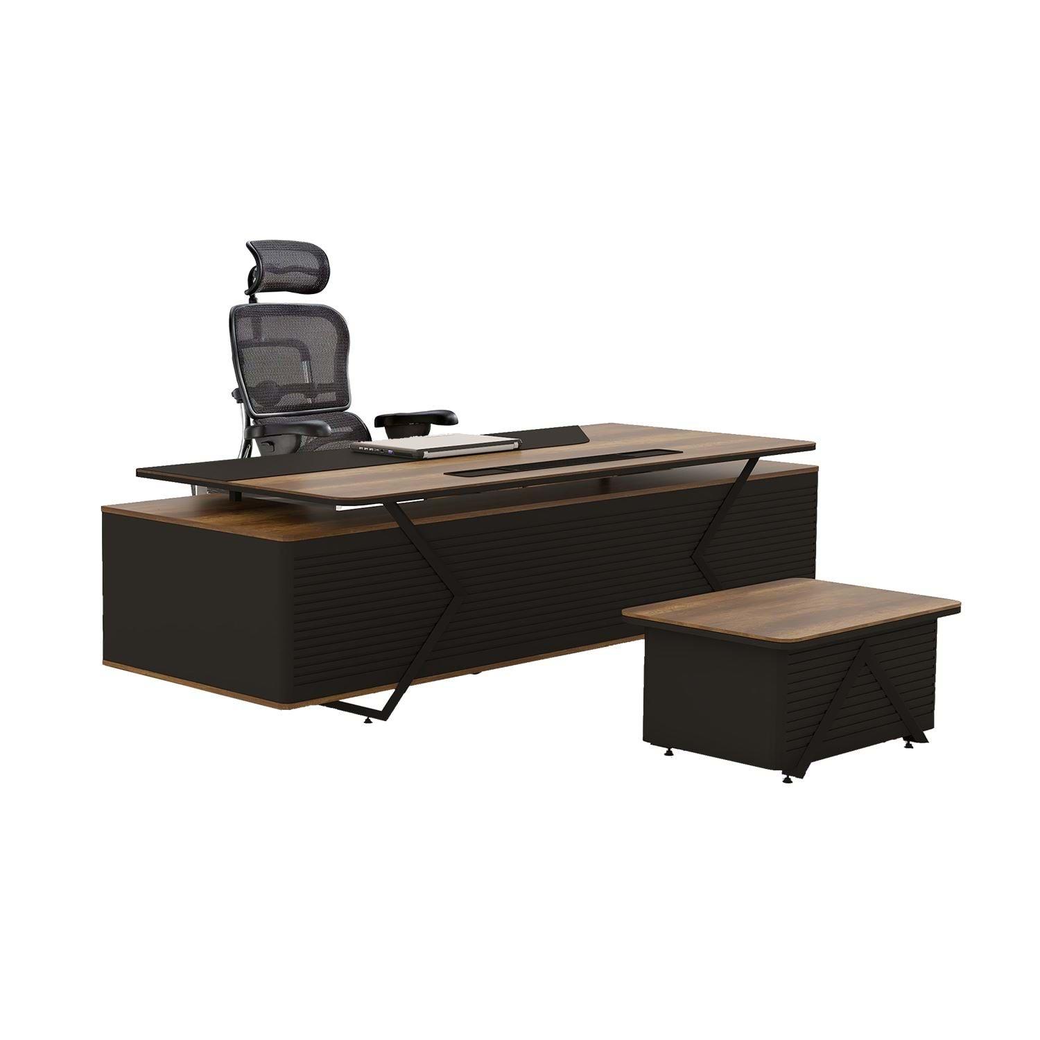 Melamin masa yüzeyleri ile metal detayların modern çizgileri bir araya getirilerek tasarlanan bu yönetici takımı, ofisinize prestij ve güçlü bir karakter katar. Dayanıklı malzeme yapısı uzun ömürlü kullanım sağlarken, geniş çalışma alanı yöneticilerin ihtiyaç duyduğu konforu ve verimliliği en üst seviyeye çıkarır.